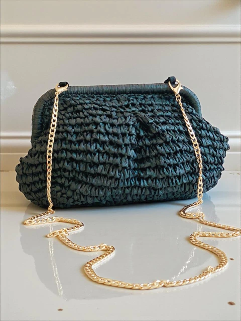 Compacto pero amplio y con carácter, tejido a mano en fibra de papel natural. Su formato con pliegues aporta volumen y un aire descontracturado que lo hace versátil: podés usarlo como clutch de mano o con su cadena dorada desmontable, según la ocasión.